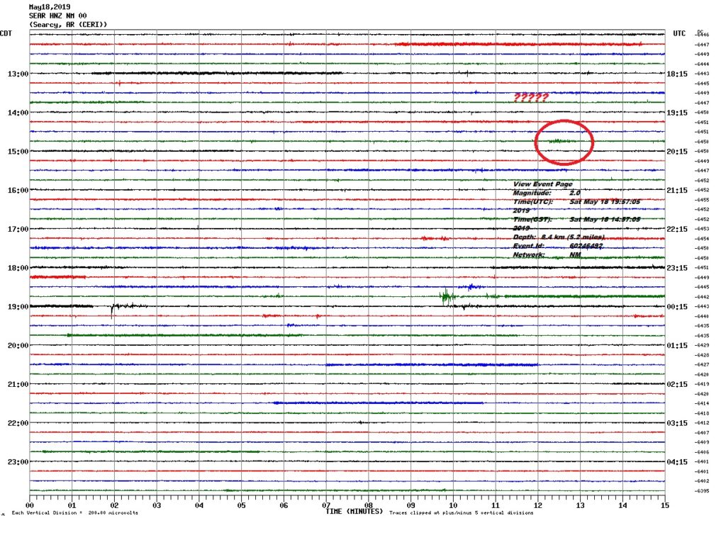 The event below did not show up on sensor other than a watch mode. The size and signature are suspicious. If this was a 2.o it should have been much more peaked. It took them 4 days to post it???? We do not think this was a valid earthquake. (LIGHTENING STRIKE?)
